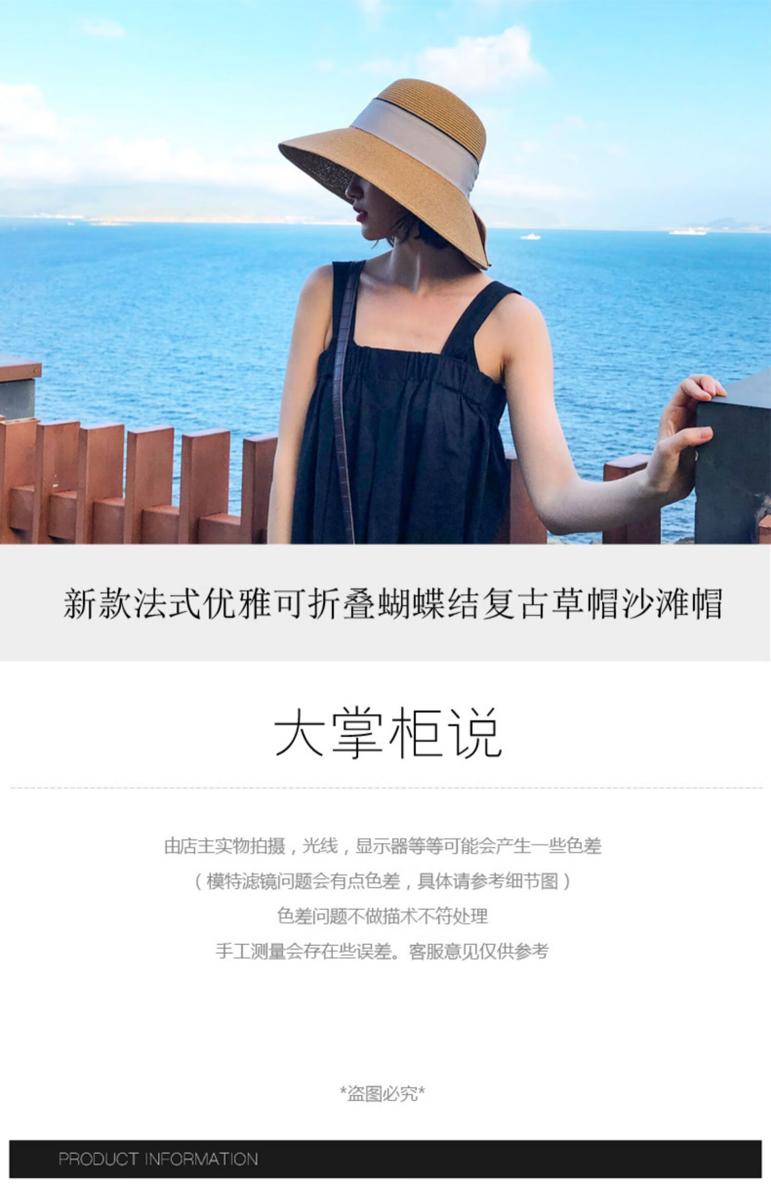 氧绘ins款草帽女夏季可折叠沙滩帽遮脸遮阳帽蝴蝶结渔夫帽太阳帽盆帽 卡其配黑色带(嵌咖啡色条) 均码(可调节配防风绳)